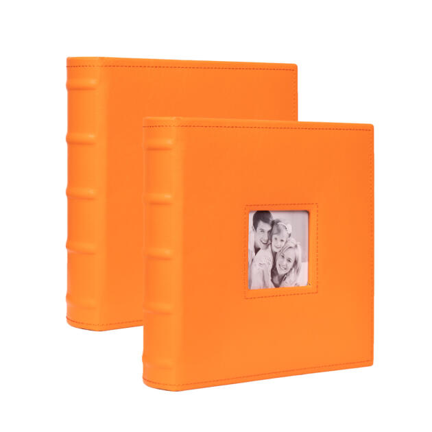 Dos álbumes encuadernados y cosidos a mano color naranja.